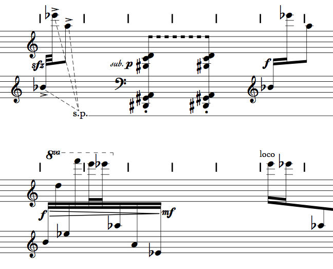 The first movement in a suite of four movements titled Tri Suite, Prologue is a solo piano work that explores the spectral style of composition. The idea was to treat the piece as if you are looking at a triangle horizontally. At this viewpoint, the observer sees the point closest to them in its entirety, as well as parts of the other points in the distance. This triangle will then rotate throughout the piece bringing the two distant points of the triangle into focus at different times. To achieve this effect, samples were analyzed from three different metal percussion triangles struck with a marimba mallet. This resulted in three separate frequency spectra which were then converted from frequency information to traditional pitches (rounding to the nearest half-tone). The three pitch groups were assigned to each point on the rotating triangle. The amount of each point you hear depends on how the triangle is orientated. To distinguish the different sets of pitches used, a different articulation and style were assigned to each point on the triangle as well as dynamics to match the depth in the visualization creating an acoustic spatialization effect.